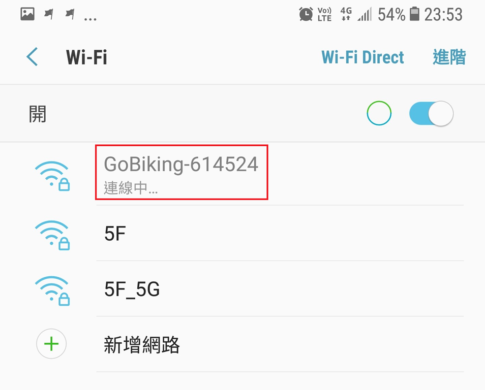 大通 PX B52X 與 PX B51 都具有 WiFi 功能,可直接與手機的 APP 連結,APP 為 PX GoBiking,直接到市集中搜尋就可以找到。當安裝完畢後,透過功能中的連接,就可找到 GoBiking-xxxxxx 的頻道,直接連結即可。當然主機上的 WiFi 功能要先打開,開啟方式上一段有說明,這裡就不再贅述。