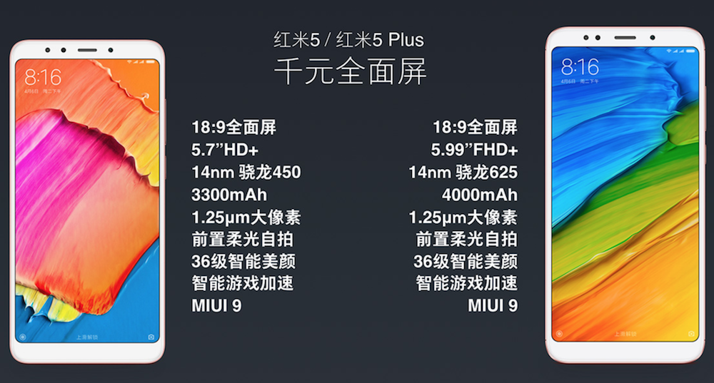 攤開紅米 5 與紅米 5 Plus 的規格表來看,除了同樣採用 18:9 的全螢幕設計,以及皆具備 1.25μm 大像素 1,200 萬畫素主鏡頭、500 萬畫素自拍鏡頭、前至柔光自拍、36 級智慧美顏、智慧遊戲加速、MIUI9 之外,兩者的規格還是有些許差異。