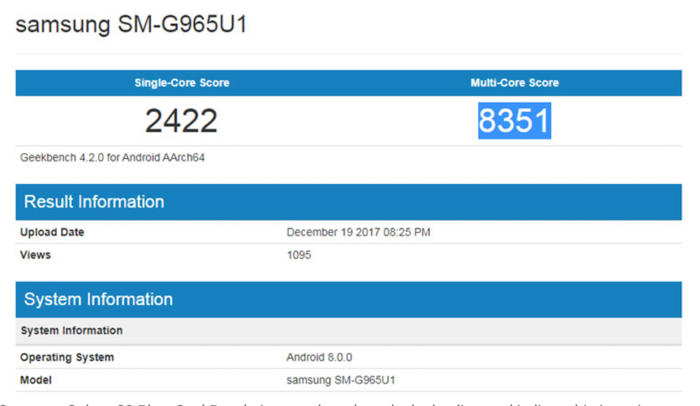 根據國外網站稍早的消息指出,近期有款產品代號為 Samung SM-G965U1 的產品,跑分成績已悄悄曝光,據了解,該產品疑似就是搭載高通 Snapdragon 845 處理器的 Galaxy S9+,從曝光的資訊來看,S845 處理器的單核成績為 2,422 分,而多核心成績更是達到 8,351 分,效能成績超越搭載高通前一代 Snapdragon 835 的 Galaxy S8+ 多達 2,317 分,預計將有更順暢的操作體驗。