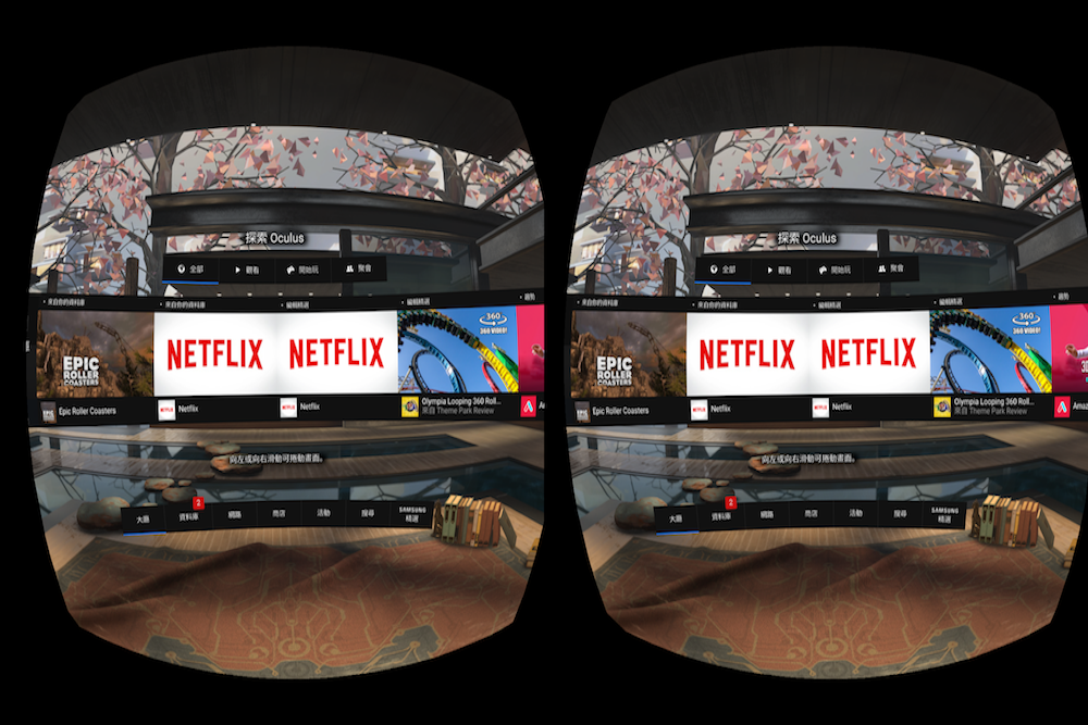 當手機與新款 Gear VR 結合且固定於眼前後,就會自動跳出 Oculus VR 大廳的畫面,這個大廳不僅能讓用戶選擇體驗已免費下載的 VR 虛擬實境遊戲或影片,還可以購買更多好玩、有趣的虛擬實境內容,不管是遊戲大作還是 360 度環景影片,都可以輕鬆滿足個人對於虛擬實境的需求。