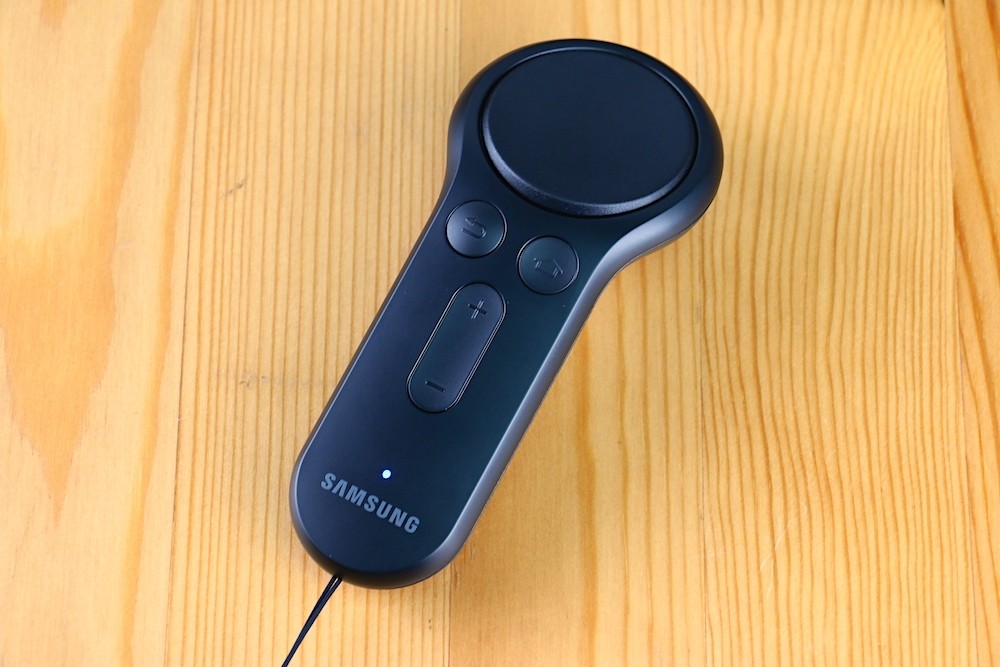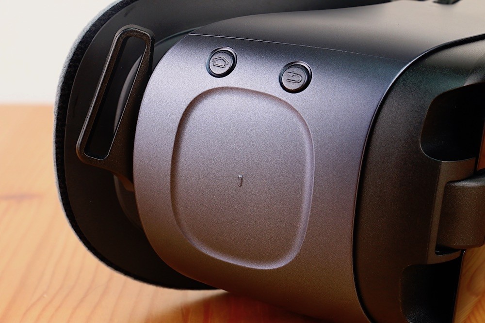 Gear VR 控制器上設置了不少功能鍵,像是可以回到大廳或是重新定位控制器的首頁鍵、返回上一頁的返回鍵、控制音量的音量鍵,以及在控制器前端,具備按鍵功能的圓形觸控盤與板機按鍵,用戶可以直接透過這個控制器操控虛擬實境中所看到的各種功能,讓使用能更加直覺。