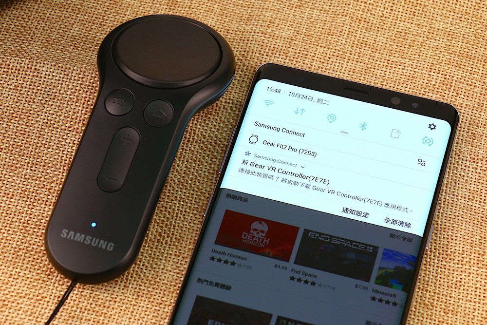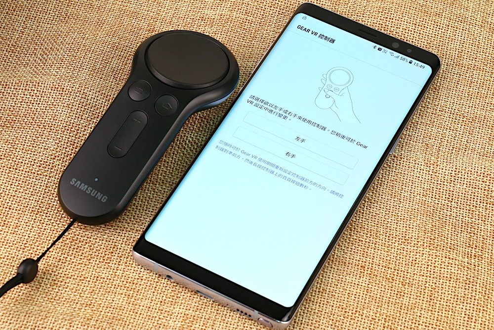 為了讓用戶有更直覺的操作體驗,三星特別針對新款 Gear VR 設計了一個 Gear VR 控制器,這個控制器同樣具備人體工學設計,握感表現非常順手且非常舒適,此外,它還具備藍牙連線能力,只要事先與手機進行藍牙配對,就能在 VR 虛擬實境中控制任何物件,不管是要選擇選項還是控制遊戲角色的武器,都能輕鬆做到。
