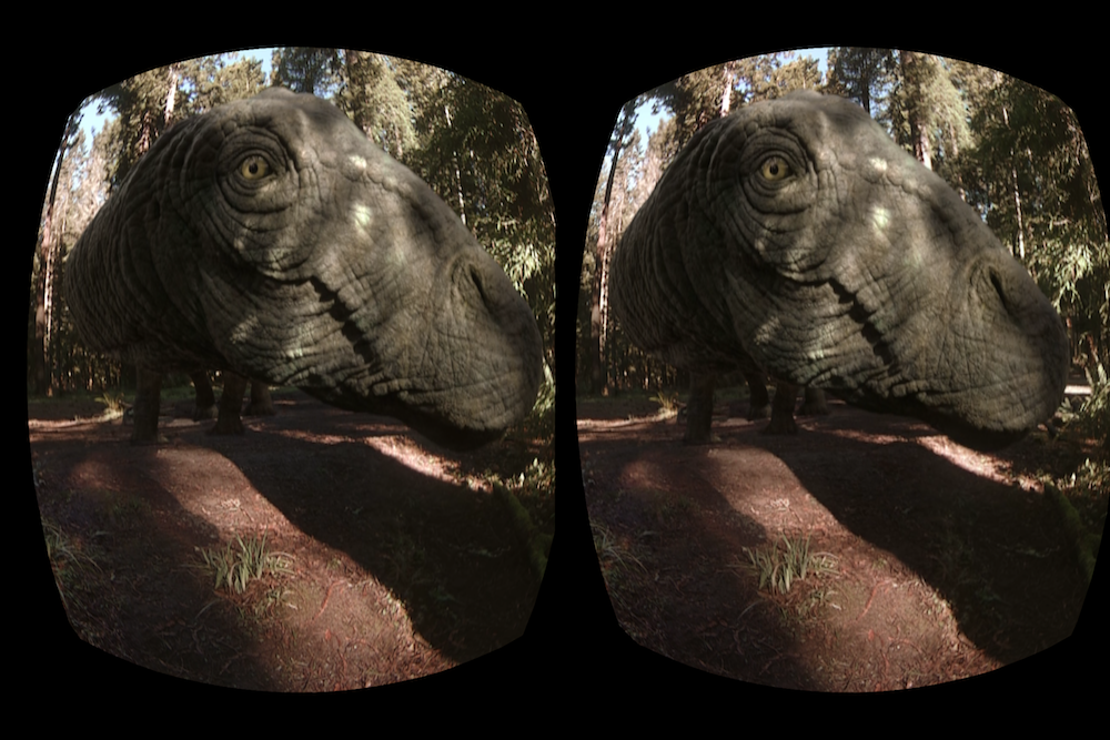 值得一提的是,新款 Gear VR 具備 101 度可視角,搭配手機螢幕所提供的 2K 解析度畫面,使 VR 虛擬實境畫面具備更多細節,也讓畫面中的人、動物、場景更加逼真。從以下幾個畫面可以看到,不管是好奇靠近的恐龍,還是設置在山谷間的雲霄飛車軌道、背景,畫質表現都更加細膩,再加上從耳機中傳來的現場音效,使得 VR 虛擬實境更有身歷其境的感覺。