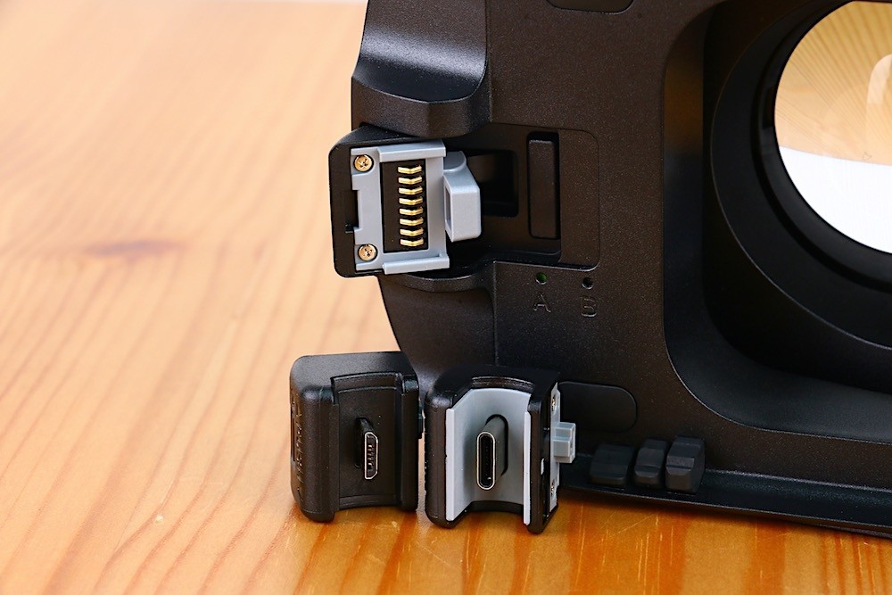 值得一提的是,因新款 Gear VR 可支援的手機款式非常多種,所以,與手機組合的連接埠採用可替換式設計,盒裝內皆有附贈一組 USB Type-C 與一組 microUSB 連接埠,無論是採用 USB Type-C 的 Galaxy Note 8、S8、S8+,還是採用 microUSB 的 Galaxy Note 5、S7、S7 edge、S6、S6 edge、S6 edge+,都可以直接安裝使用。