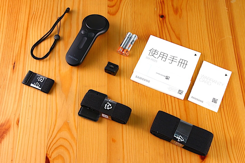 盒裝配件部分,由左上至右下,分別為 Gear VR 控制器吊環、Gear VR 控制器、兩個 4 號電池、連接埠轉接器、使用說明數份,以及控制器固定帶與三點式固定帶。