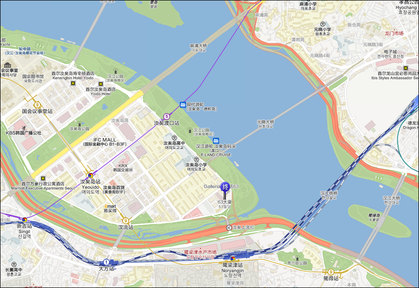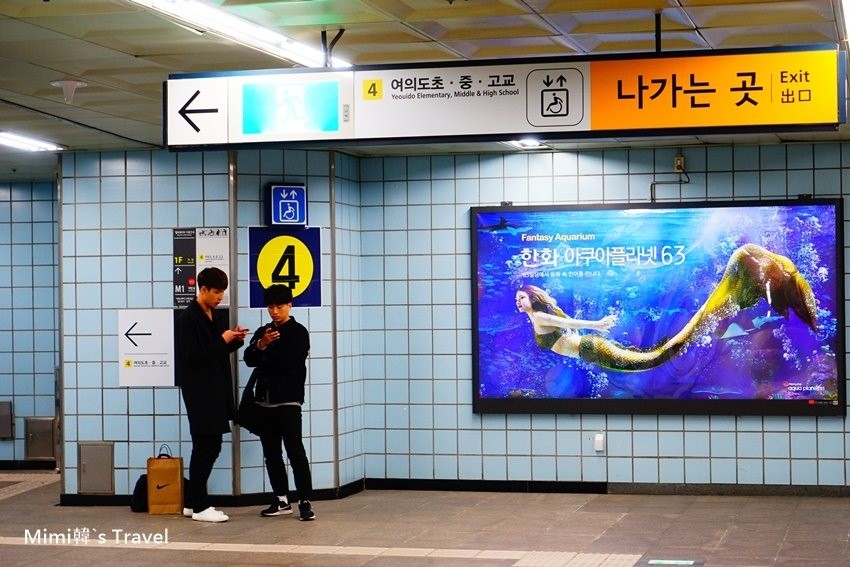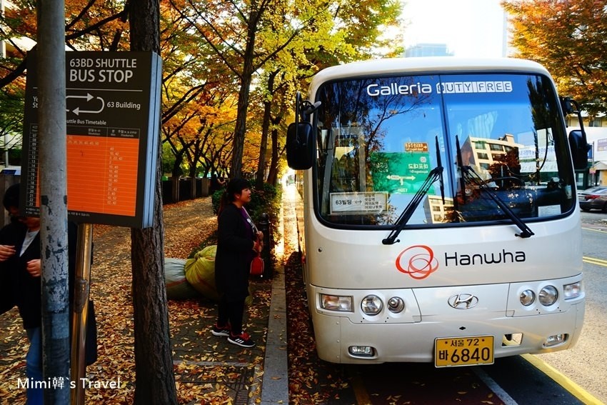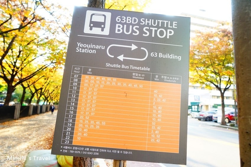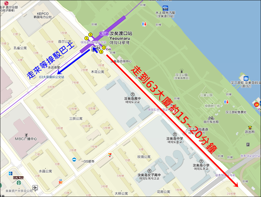 我們是選擇搭到汝矣渡口站,從4號出口直走20分鐘就能抵達63大樓,如果不想走那麼遠,就向上圖那樣走去等免費接駁巴士。