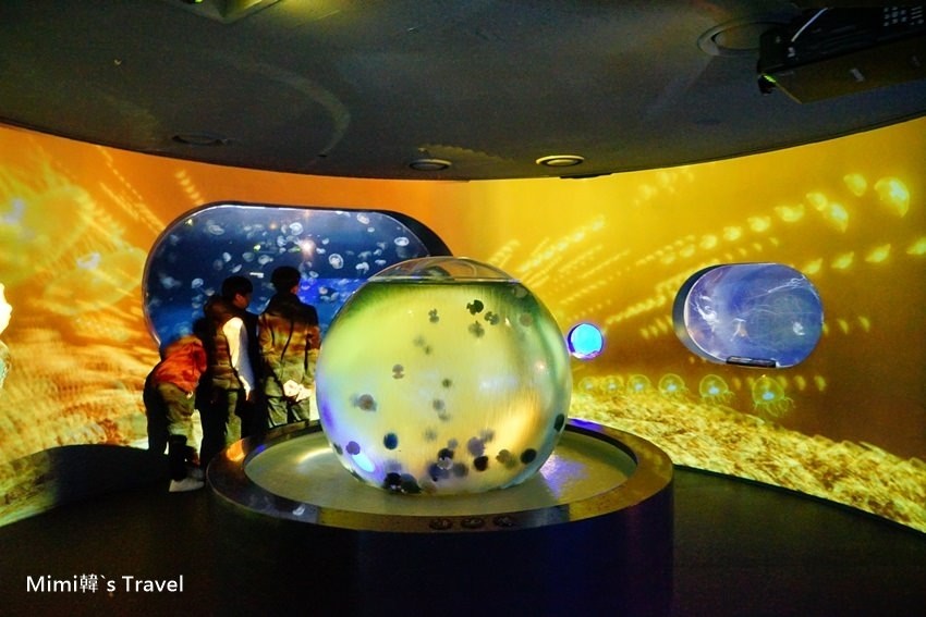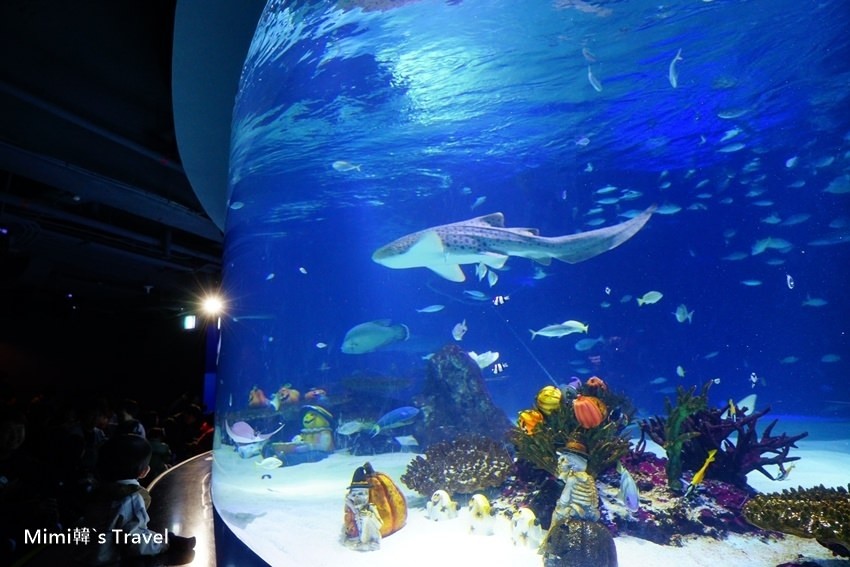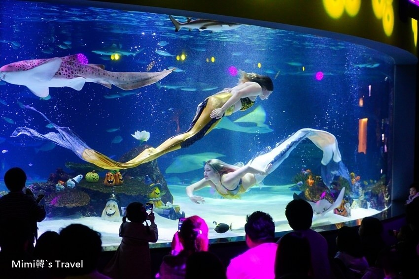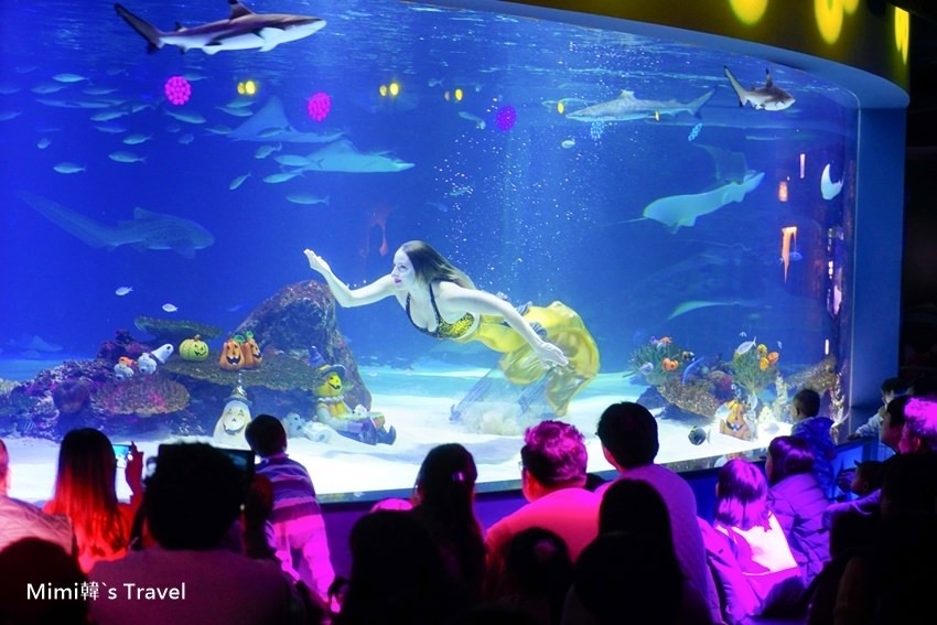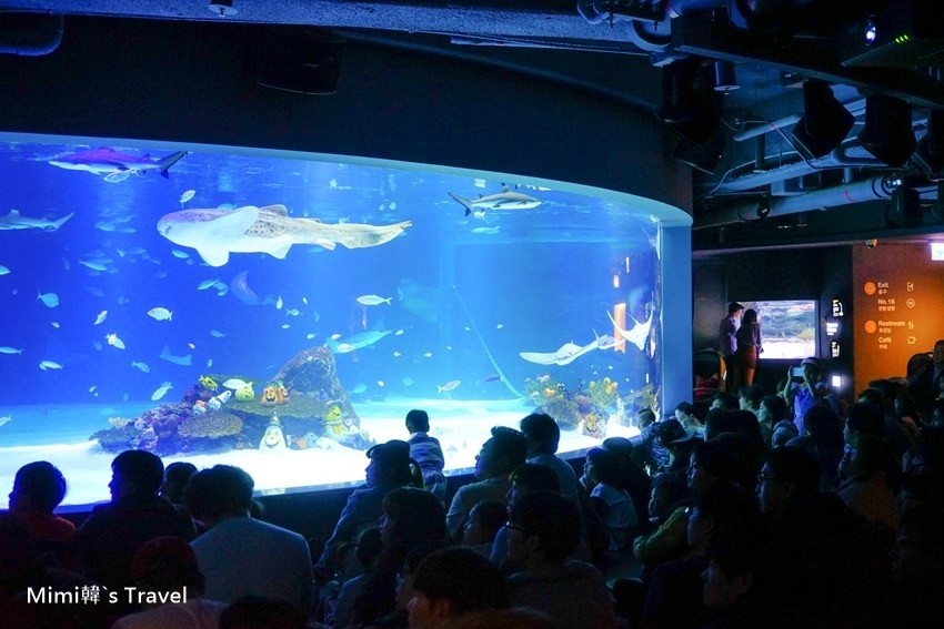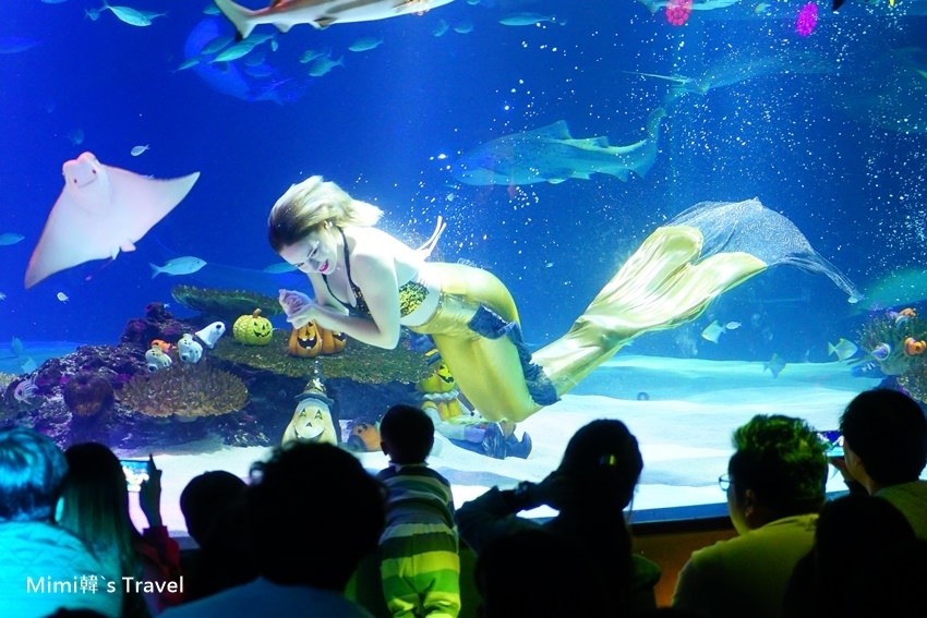 而其中必看的就是大水族箱的美人魚演出,時間快到觀賞區就擠滿人潮,入口處還貼心的提供坐墊給遊客使用。