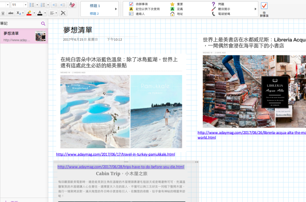 只要看過東京的行程規劃筆記,應該就可以發現我在每個筆記頁面都有呈現不一樣的方式,OneNote彈性真的很大,可以畫重點、改底色、標註星號甚至有勾選方塊,平常我看到旅遊資訊也最能隨手的貼上筆記本內當旅行記錄,甚至還可以用觸控繪圖,比起EXCEL或是WORD簡單一百萬倍呀~~~~