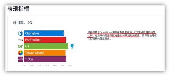 - 「4G可用率」定義:「該指標顯示OpenSignal用戶在各業者網路上LTE連線可用的時間比例。它反映的是用戶能夠連線4G網路的頻繁度