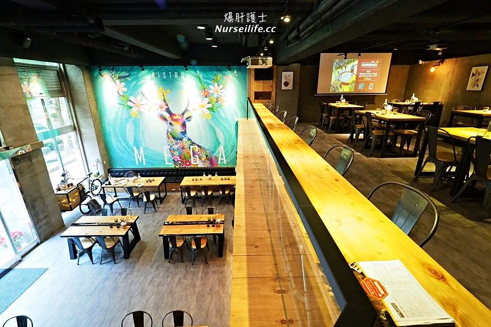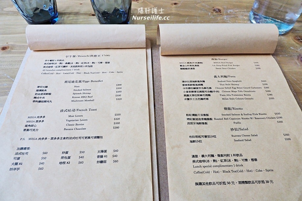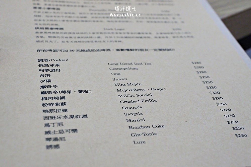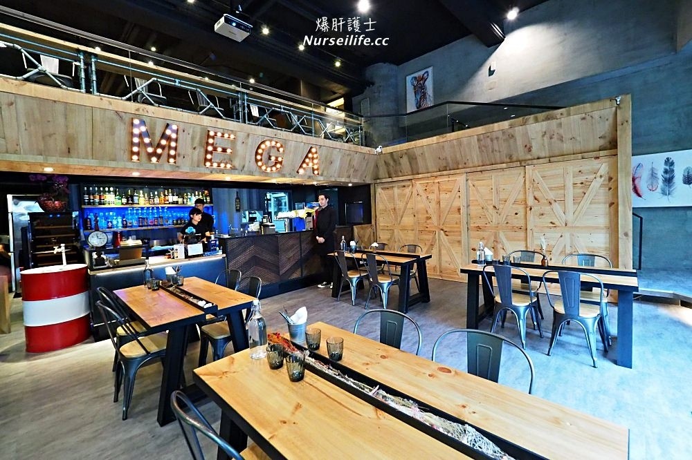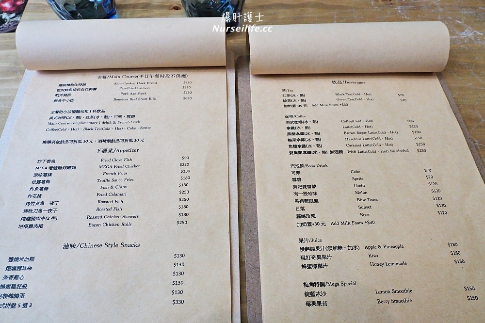 走進MEGA令人覺得新奇的是兩層樓的超大空間,還有正中間就可以看到酒櫃,除了提供了不擁擠令人感到放鬆的環境以外,翻開菜單,有些菜名真心讓人覺得會心一笑,還會覺得真的有這種菜色嗎?