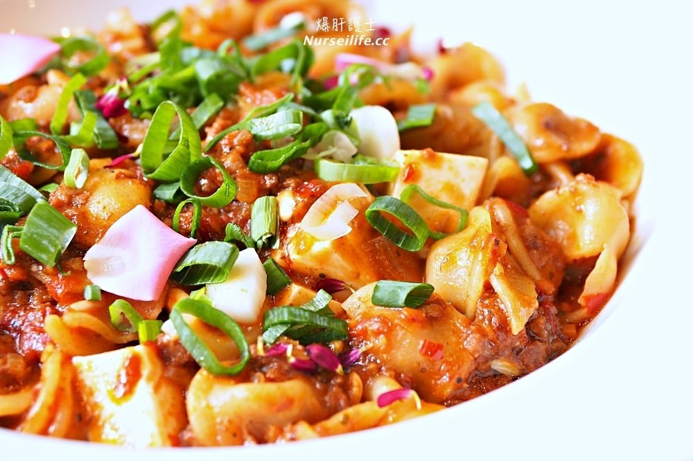 擺盤上還特意弄了幾朵玫瑰花瓣,真的是很假掰的一道,用貓耳朵麵除了可以吃到QQ的麵條口感,還可以輕易的巴住醬汁,讓每一口都可以嚐到麻婆豆腐的風味。