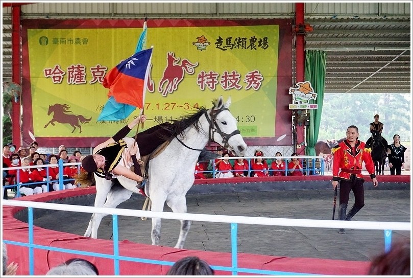 ▼另外也有男性表演者,在奔馳的馬上下腰或是揮舞國旗對他們來說也是小菜一碟啊!不過精彩的飆馬秀看得相當過癮,也是國內較為少見的特技秀!