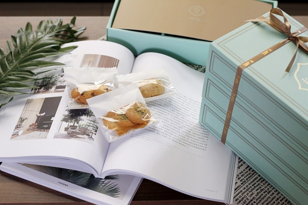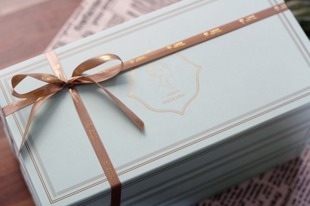 Candy Wedding 的餅乾禮盒使用它們的主色湖水綠,搭配印有Logo 咖啡色緞帶包裝,非常有質感,送禮十分體面。遇到大節日卻不想再送市售常見的喜餅、彌月蛋糕、傳統的月餅、粽子時,帶上一盒手工餅乾是很不錯的選擇。
