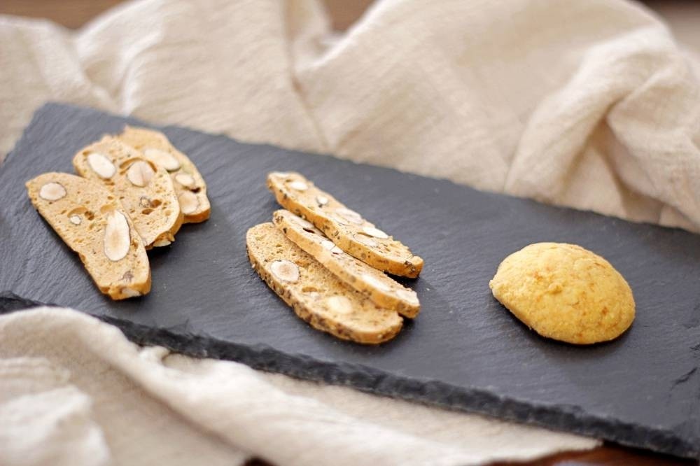 這兩款餅乾中都包含杏仁果粒與開心果粒,脆片口感微硬清脆,比較適合牙口好一點的人。