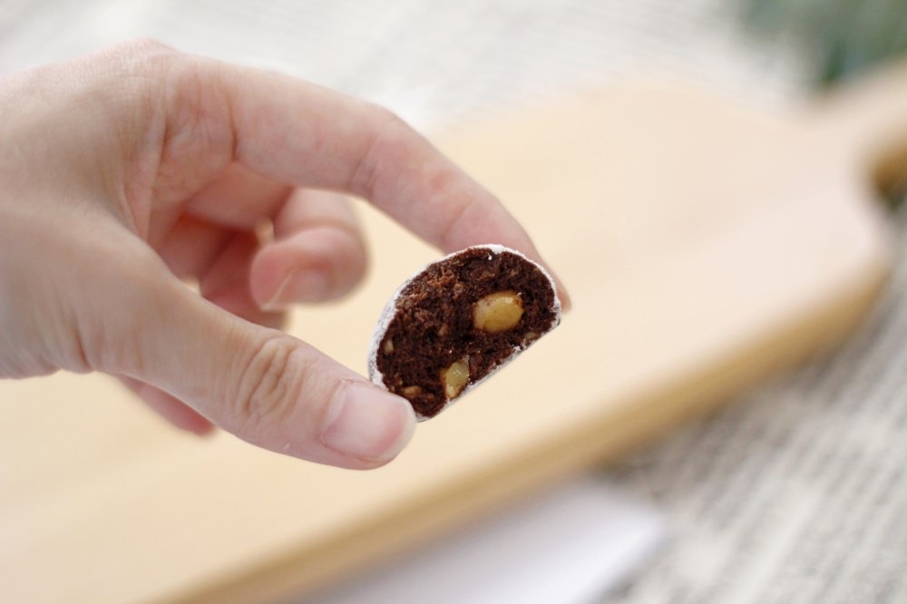 這是一款外層撒上糖粉,包了核桃的巧克力球。