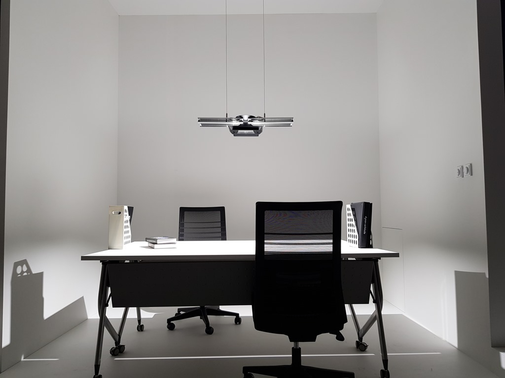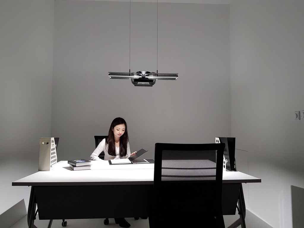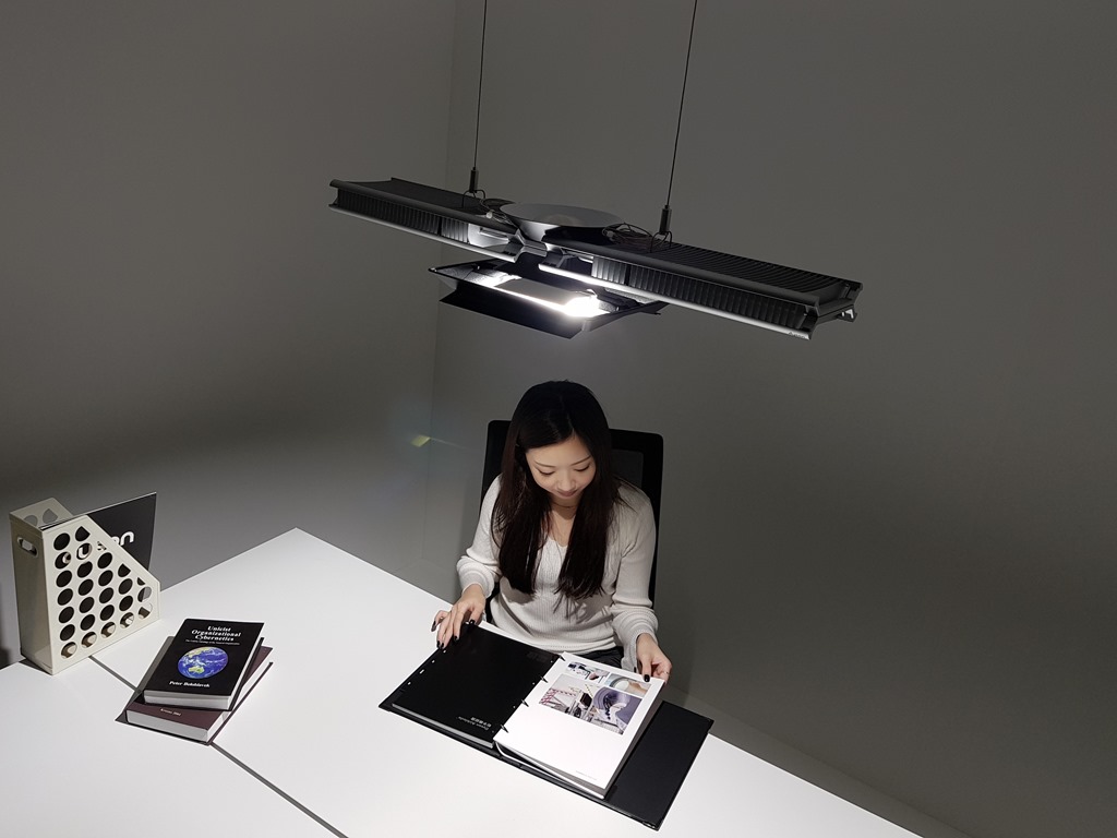 Cu_Beam Duo 吊燈依照人在一天中不同時段與不同場所對光的需求,設計出具有上下燈源、可調整亮度與光照比例的吊燈。以實際使用為例,當在工作桌上閱讀時,可提高下照光比例,方便閱讀與工作,離開座位後,就可增加上光源的比例,讓整個空間有更舒服的間接照明。