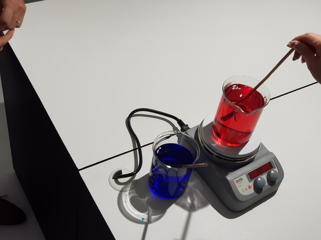 現場實際以內部的真空散熱管實驗,直接擺放在紅色的熱水中,不到幾秒鐘就感受到熱,移至藍色冷水中時,也瞬間就感受到溫度下降,