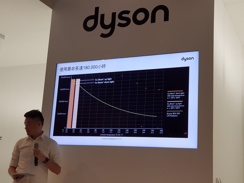 Dyson 所推出照明系統,最重要的設計就是可以降低光源熱量的熱管技術,將溫度維持在攝氏 50 度以下,在這溫度下,LED 可維持 180,000 小時的壽命,也就是將近 37 年的使用時間,這是非常驚人的突破。但如果沒有這個降溫技術,LED 燈具將產生高達 攝氏 100 度以上的高溫,讓 LED 壽命大幅降低。
