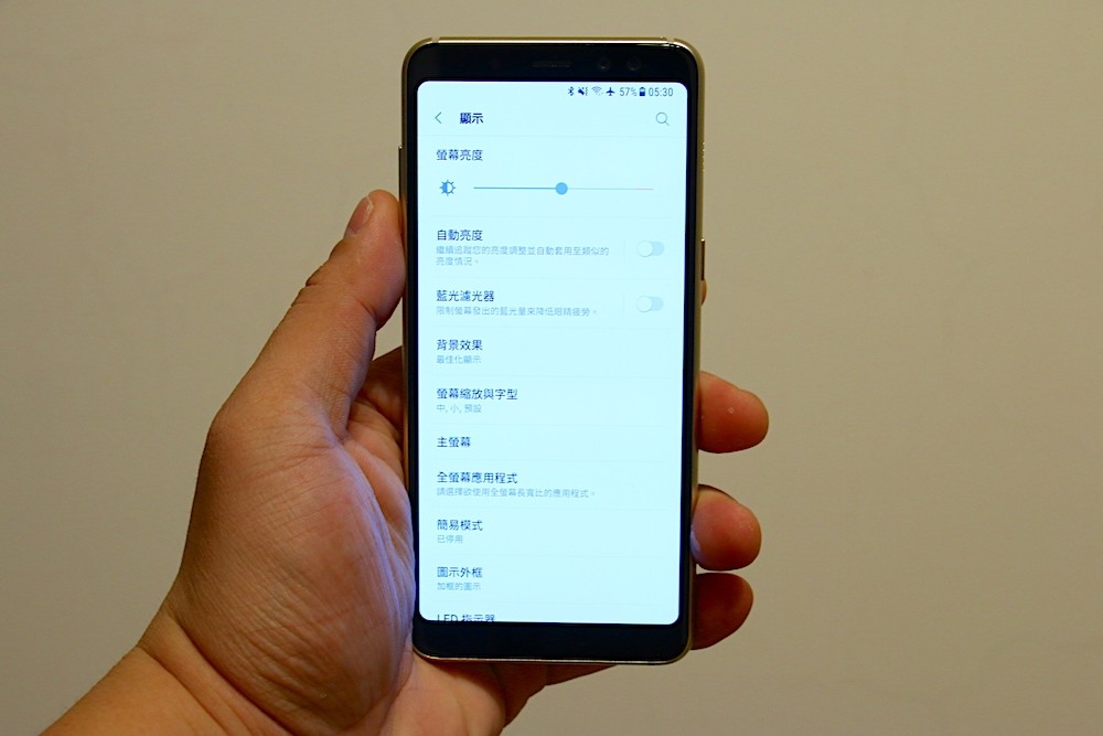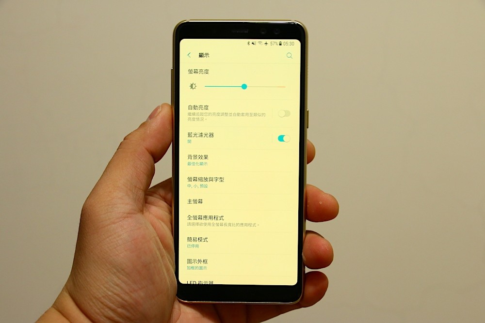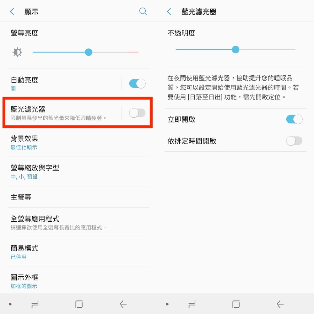 有鑒於不少用戶都會長時間盯著手機螢幕追劇、閱讀電子書,或是在昏暗的環境中玩手機遊戲,因此,Samsung 在 A8 (2018) 的顯示功能中內建了「藍光濾光器」,來保護用戶的眼睛不受藍光傷害。開啟此功能後,不僅可以依照個人喜好調整不透明度,同時也可以利用「依排定時間開啟」來設定開啟的時間,讓藍光濾光器可以依照用戶的指定時間自動啟動。