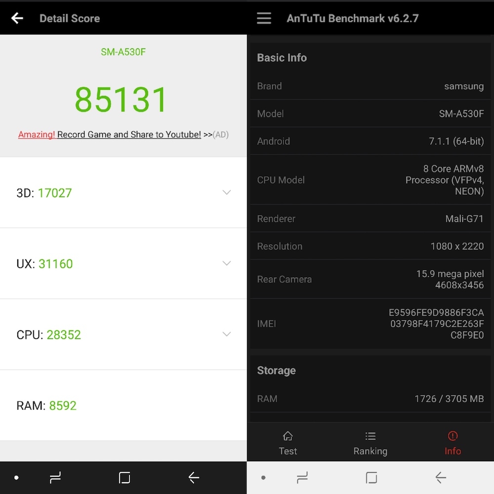 配備三星自家 Exynos 7885 處理器、4GB RAM/32ROM 的 A8 (2018),其效能表現相當不錯,經跑分軟體實測,效能成績差不多落在 85,131 分左右,而這樣的效能表現足以應付日常生活中的使用、追劇、玩遊戲,或是透過社群軟體與朋友互動。