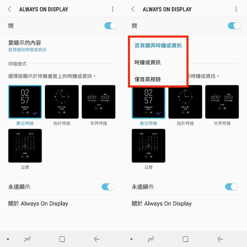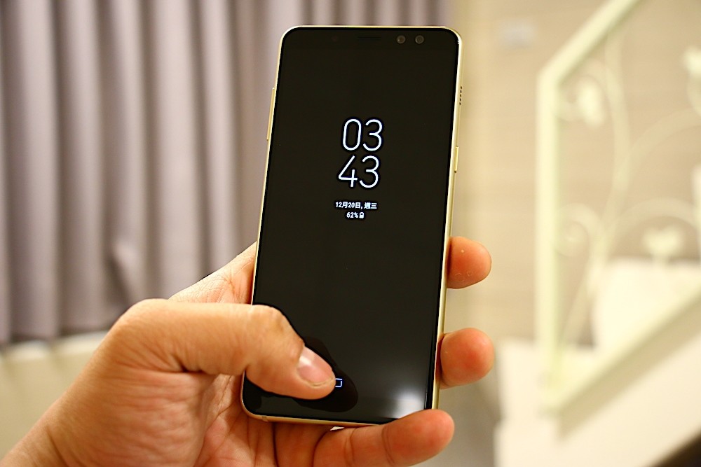 A8 (2018) 內建了非常好用的 Always On Display 功能,只要從設定選項中將它啟動,就能讓手機在進入待機狀態時,顯示出目前的時間、日期、剩餘電量,以及是否有未接來電、App 通知…等資訊。此外,用戶還可以透過下方的「永遠顯示」功能,來設定 Always On Display 的顯示時間,比方說上班時間整天顯示,下班後則是關閉顯示,讓用戶可以將工作與休息的時間完全區分開。