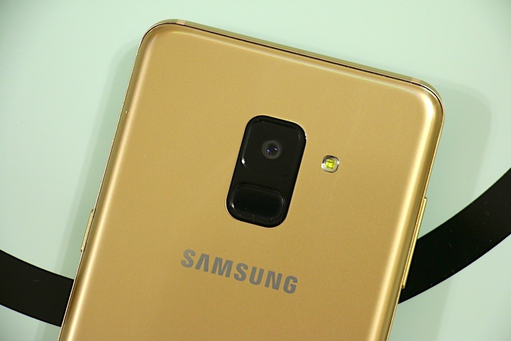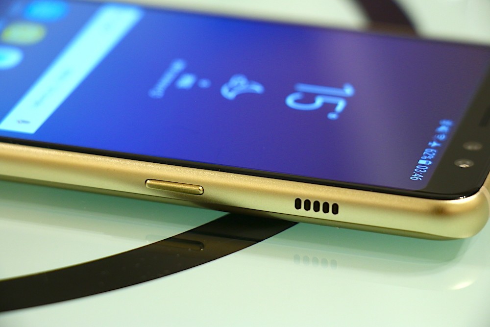 翻到機身背面,可以明顯看到 A8 (2018) 的背蓋材質已不是一體成型金屬,而是改為符合人體工學的雙曲面玻璃背蓋設計,搭配環繞在機身周圍的金屬中框,除了能大幅提升手機的質感與握感之外,另一方面也讓 A8 (2018) 完整繼承 Galaxy S 與 Note 系列的高質感玻璃機身。