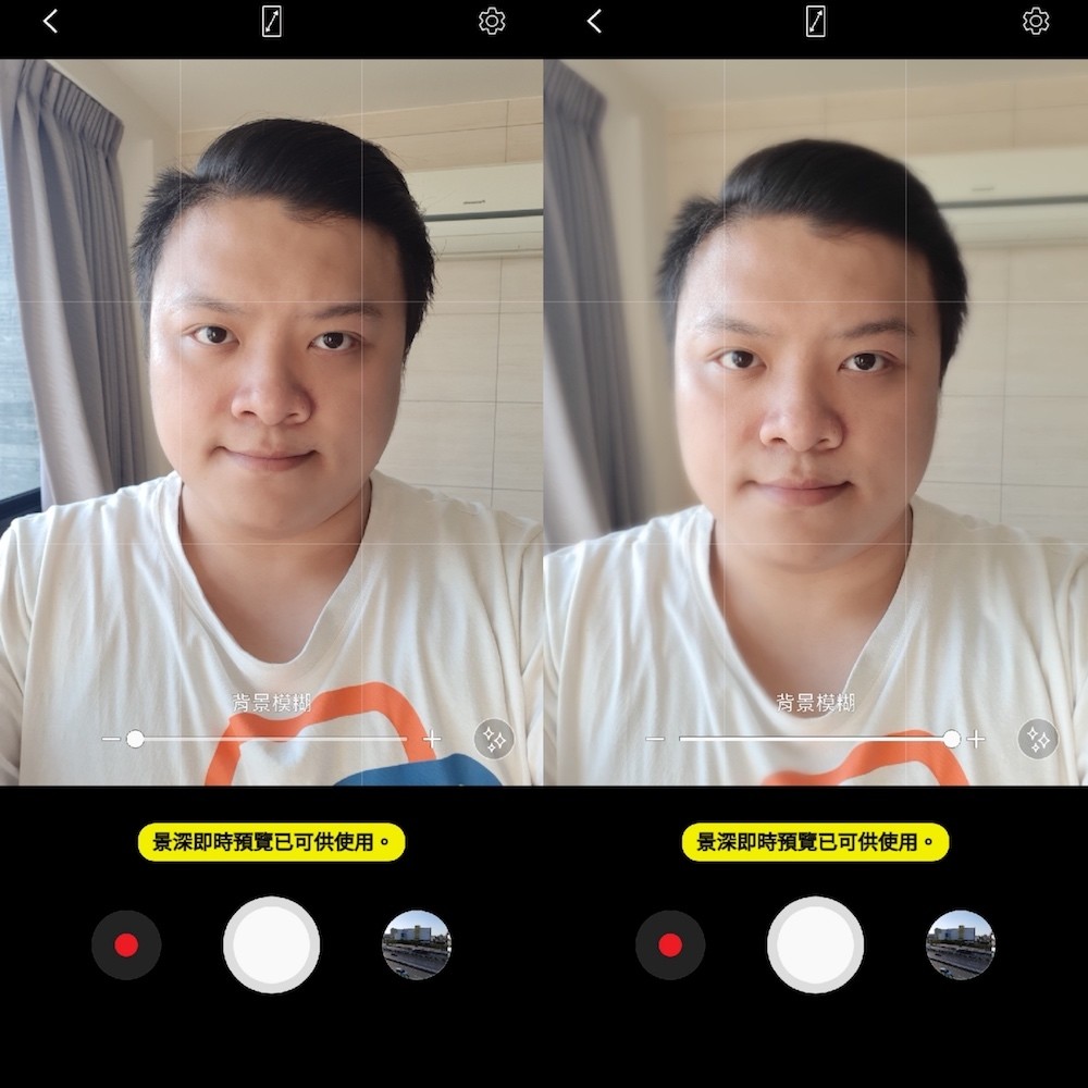 以下兩張照片是透過景深即時預覽所拍攝的照片,在沒有開啟景深效果的時候 (上圖),冷氣機上的字樣、牆上的紋路,以及窗簾的皺摺都能清楚看見,而將景深預覽模式開到最強時 (下圖),上述的這些背景通通都自動虛化,且虛化效果非常自然,能拍出不錯的人像特寫。