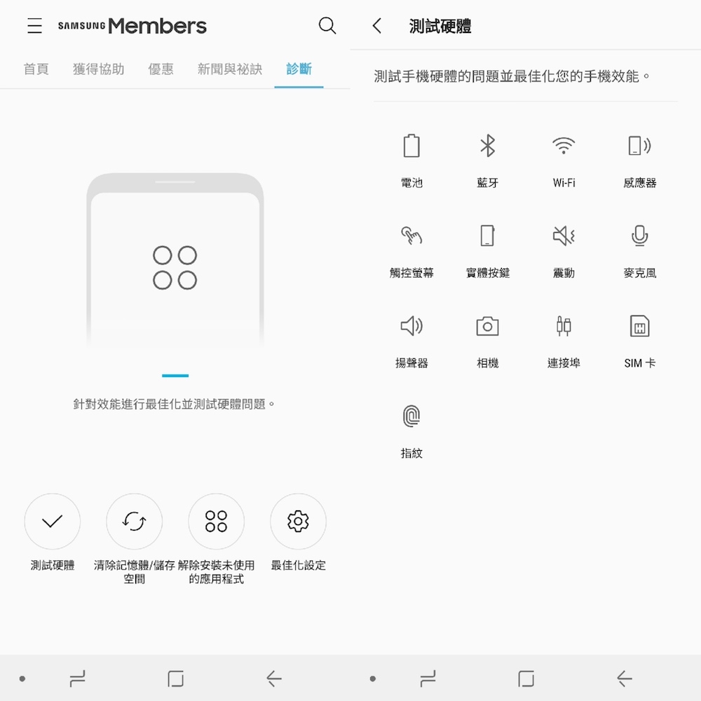 Members 除了可以瀏覽各種資訊,以及將個人意見直接回饋給官方外,它還具備硬體診斷的功能。當用戶發現自己的手機使用起來不太對勁時,可以利用內建的「診斷」功能來檢測手機的各個硬體元件是否正常,如果正常則可以安心的繼續使用;相反的,若發現某個硬體元件不正常,也能讓用戶儘早將手機送往服務中心報修。