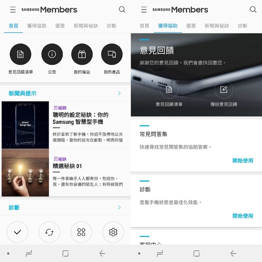 為了提供用戶所需的資訊與幫助,Samsung 在 A8 (2018) 的 Samsung Experience 8.5 中,內建了具備多元服務的 Samsung Members,只要開啟此 App,就能在裡面瀏覽有關 Samsung 各種產品的相關新聞與提示、商品優惠資訊,甚至還能將自己的使用意見,透過「意見回饋」功能回饋給官方,讓官方能直接聽見用戶的心聲,解決用戶的使用問題。