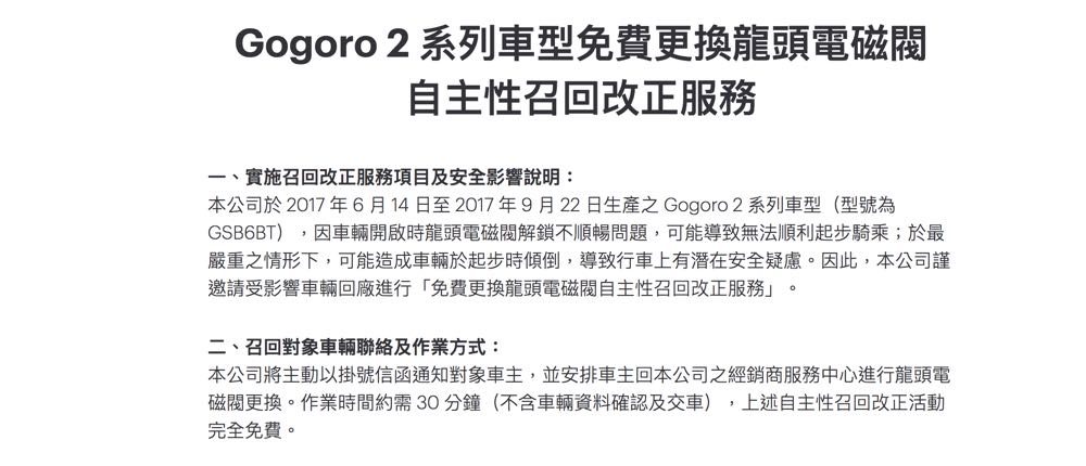本公司於 2017 年 6 月 14 日至 2017 年 9 月 22 日生產之 Gogoro 2 系列車型(型號為 GSB6BT),因車輛開啟時龍頭電磁閥解鎖不順暢問題,可能導致無法順利起步騎乘;於最嚴重之情形下,可能造成車輛於起步時傾倒,導致行車上有潛在安全疑慮。因此,本公司謹邀請受影響車輛回廠進行「免費更換龍頭電磁閥自主性召回改正服務」。”