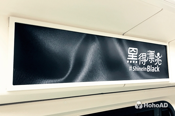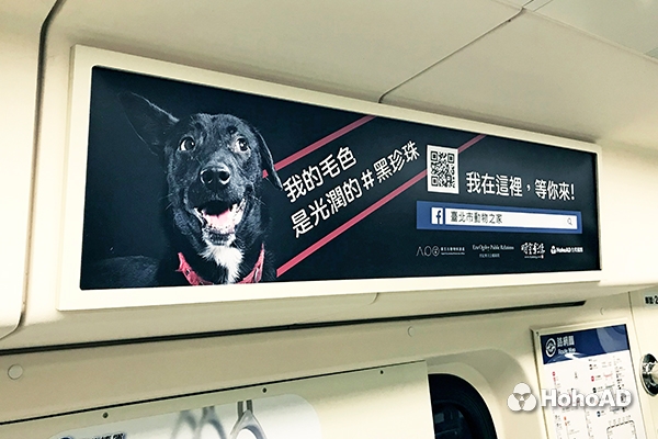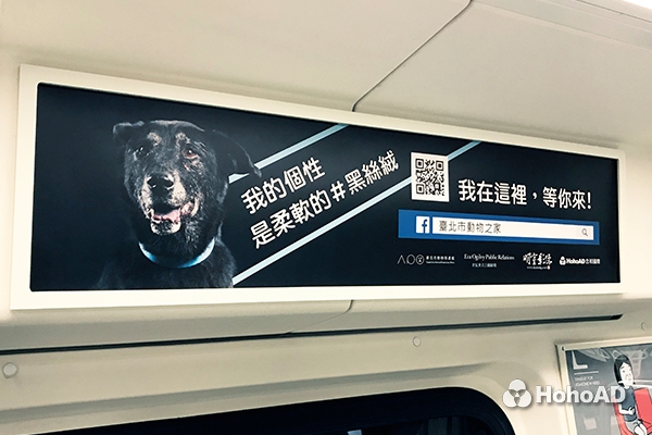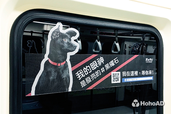 移動數位時代,戶外廣告是訊息曝光效益極大化媒體之一,合和集團也一同參與Black in Shine公益專案,贊助臺北捷運海報專車及街道傢俱(候車亭)廣告版位,黑狗現身車廂內海報,可愛模樣吸引人注目,貼近旅客位置的破格窗貼,有著強烈溝通訊息的優勢,更能激發起旅客內心情緒;24小時曝光訊息特性的街道傢俱,宛如是替黑暗處,無法發聲的毛小孩,吐露流浪街頭的心聲,正好也如毛小孩,習慣在特定地點徘徊不定的特性一樣,最終期盼是得到一個溫暖的家。廣告落點於住宅區、公園、校園等人潮眾多處,地緣性廣泛觸及行經旅客,網羅定點通勤族群,透過無間斷重複傳播頻率,深入滲透,而好的內容、好的地點,僅透過清晰影像、粉絲團和QR CODE資訊,一目了然的閱讀畫面,便能達到清楚傳達訊息,順勢也提升廣告說服力及好感度。