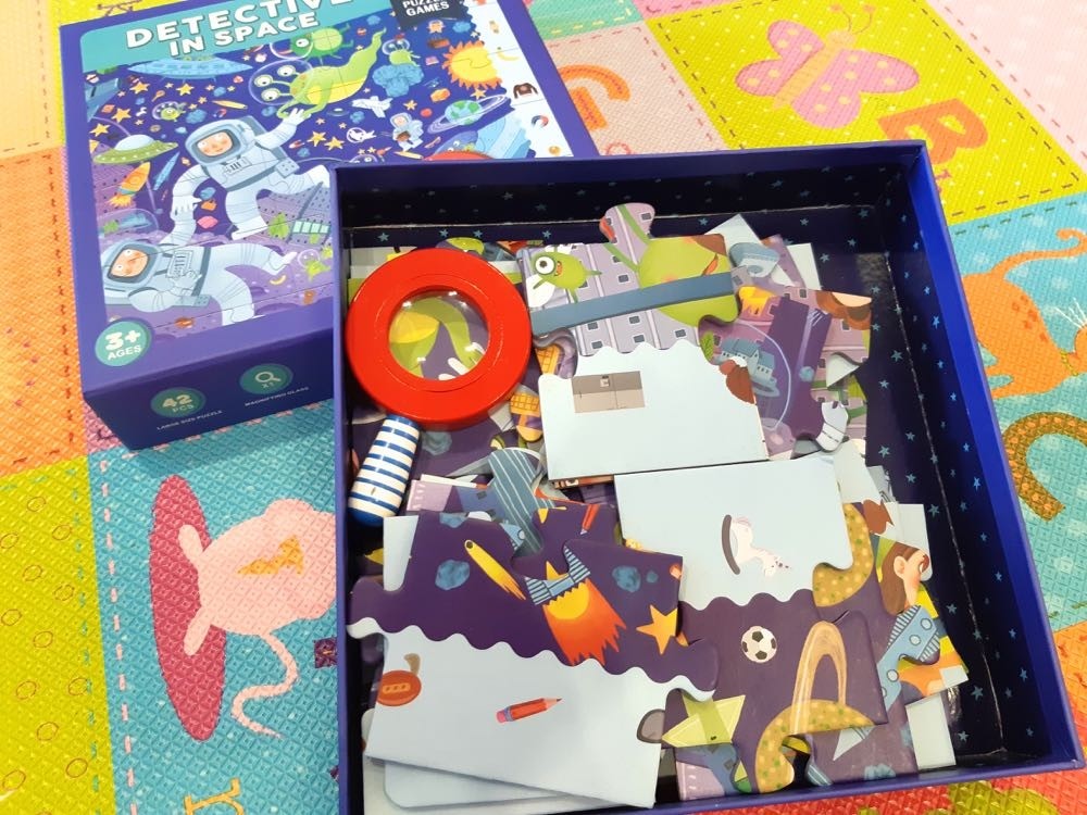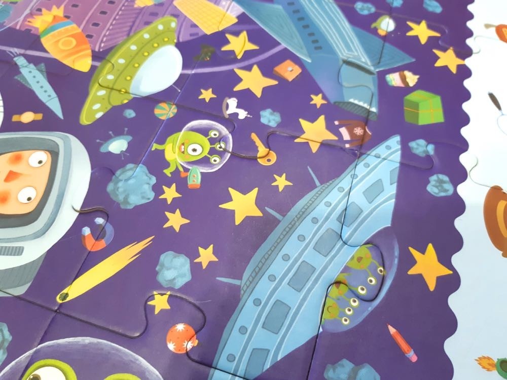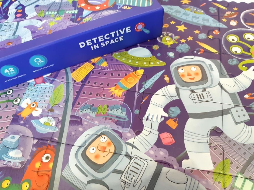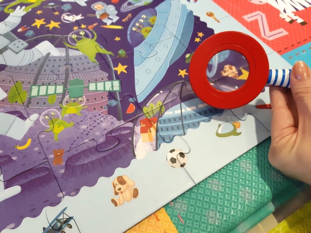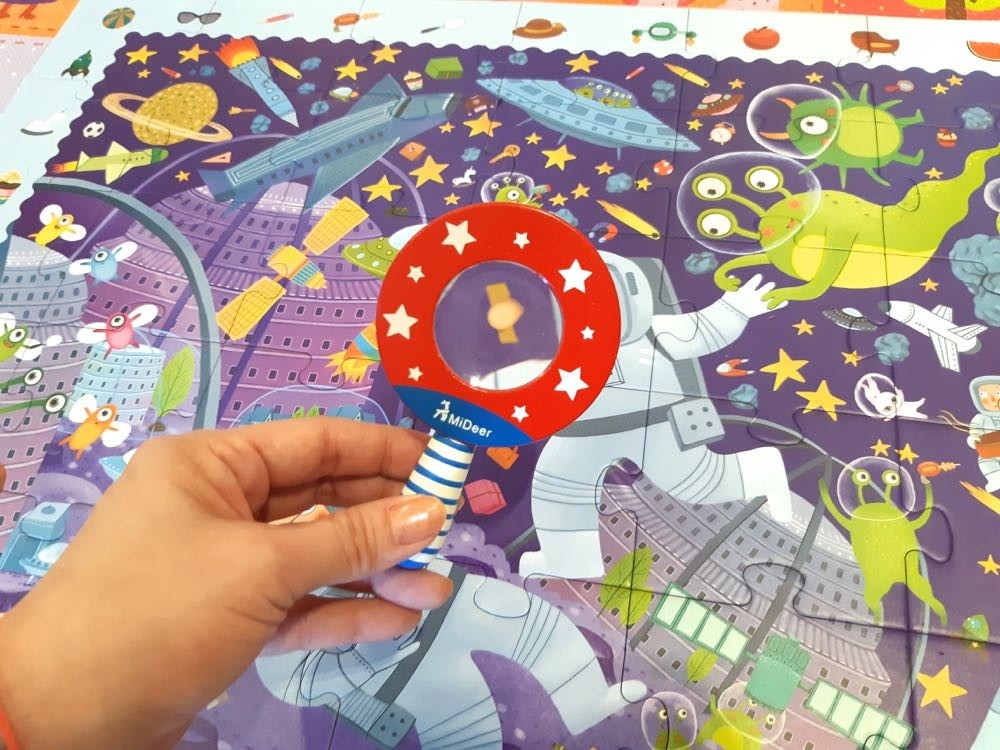 原來當拼圖拼完後我們可以發現它在周邊有著例如眼鏡、娃娃、帽子、香蕉、蘋果等各式各樣的小東西,會分別散落在太空中的任何一處。我們還可以和小朋友用放大鏡來互動,一起在太空中尋找那些指定的小物,也讓我們可以透過這款拼圖與孩子增加互動歡樂回憶與觀察力的訓練。
