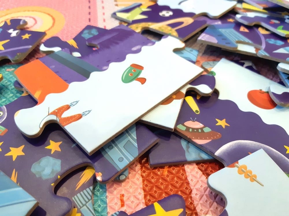 除了拼圖本身顏色豐富和有著太空人、土星、地球、外星人等豐富多樣的圖案來吸引小朋友的興趣,大小適中的尺寸更讓小朋友在拼圖的過程中能夠訓練手指拿捏、方向調整的靈活度。