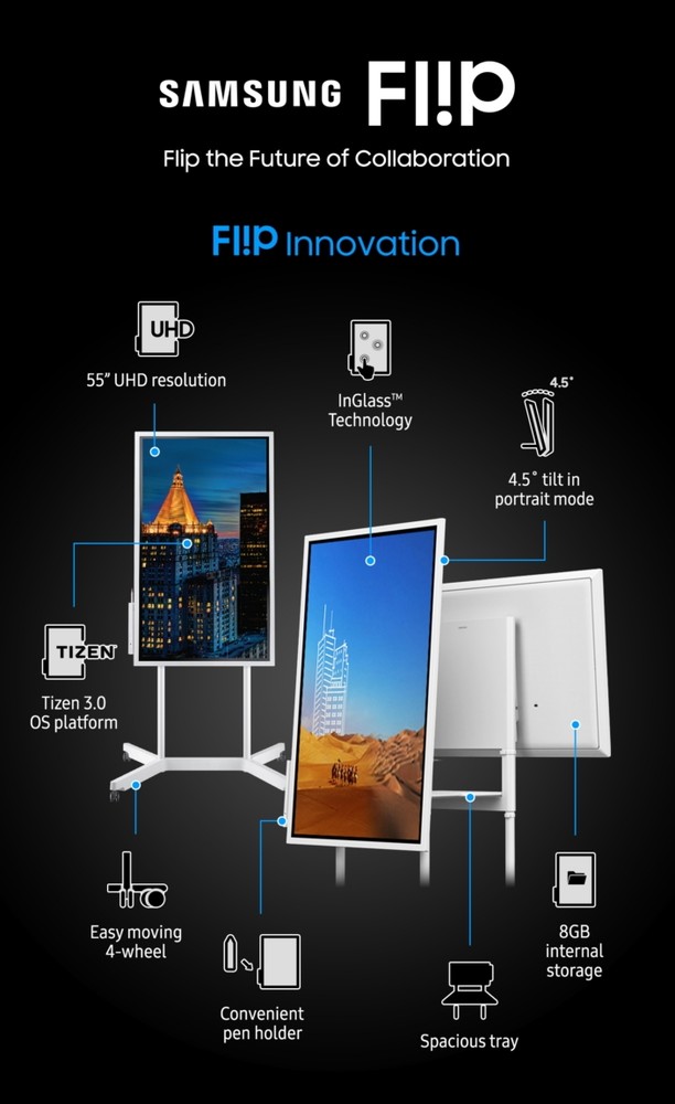 Samsung Flip 能夠讓用戶透過 WiFi、USB 來將資料傳送到板上,與會者還能直接利用手來取代我們平常使用的白板筆,來直接在資料上畫筆記、做重點紀錄。Samsung Flip 還內建了 8GB 的儲存空間,會議結束後用戶可以透過 NFC、WiFi 把會議資料剛剛大家的集思廣益儲存到自己的手機或電腦之中,也能直接利用 email 來發送。
