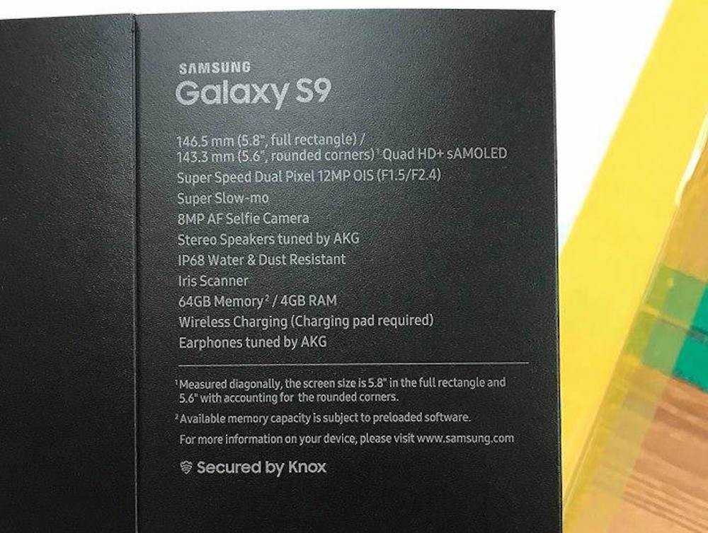 根據這個疑似三星 Galaxy S9 市售版本外盒上的資訊來看,Galaxy S9 將配備 5.8 吋的 Quad HD Super AMOLED 螢幕、800 萬畫素自拍鏡頭、4GB RAM/64GB ROM、IP68 防塵防水、無線充電能力,以及附贈 AKG 調音的耳機。不過,最大亮點並非上述這些規格,而是會配備一個「Super Spped 1200萬畫素 Dual Pixel 相機」,除了 1.28 um 的像素尺寸外,還將具備 F1.5 與 F2.4 可變光圈,讓使用者可依照拍攝環境調整光圈的大小,提升昏暗環境的進光量。此外,Galaxy S9 還會內建類似 Sony 的超級慢動作錄影的「Super Slow-Mo」,預計將以 1,000fps 的方式呈現。