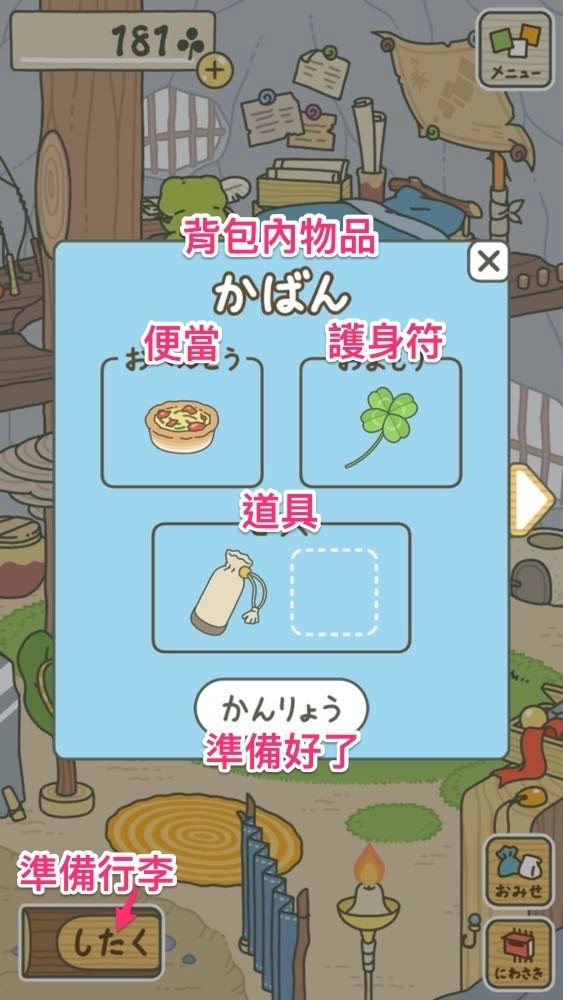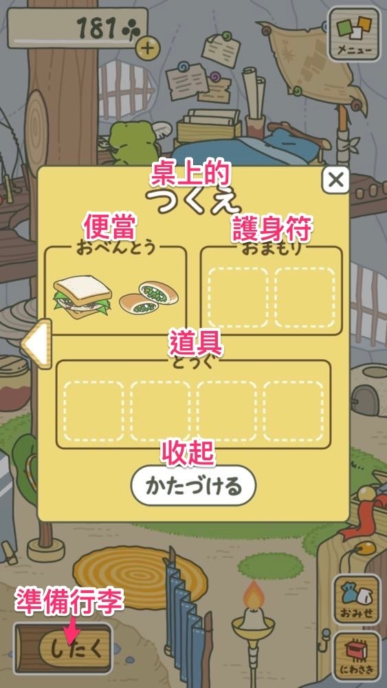 裡面有分為兩類,第一個藍色的是幫青蛙背包中準備,分為「便當」、「護身符」和「道具」三種,我們可以幫他準備好三種就能準備出發; 另一個黃色的選項是「桌上物品」,什麼意思呢?原來當我們的小青蛙外出時,我們可以將下次他要去旅行時會用到的東西先準備在桌上,這樣如果小青蛙回來時,就可能會直接把桌上的東西放到背包中,再次出發!