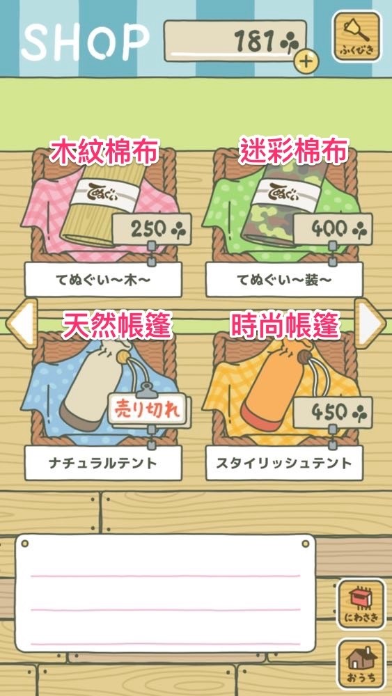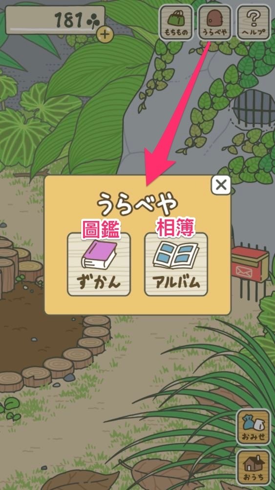 上方的目錄則是點進去會分為現有物品、圖鑑(目前蒐集到的明信片、伴手禮)與幫助(就是問答概念的地方)。