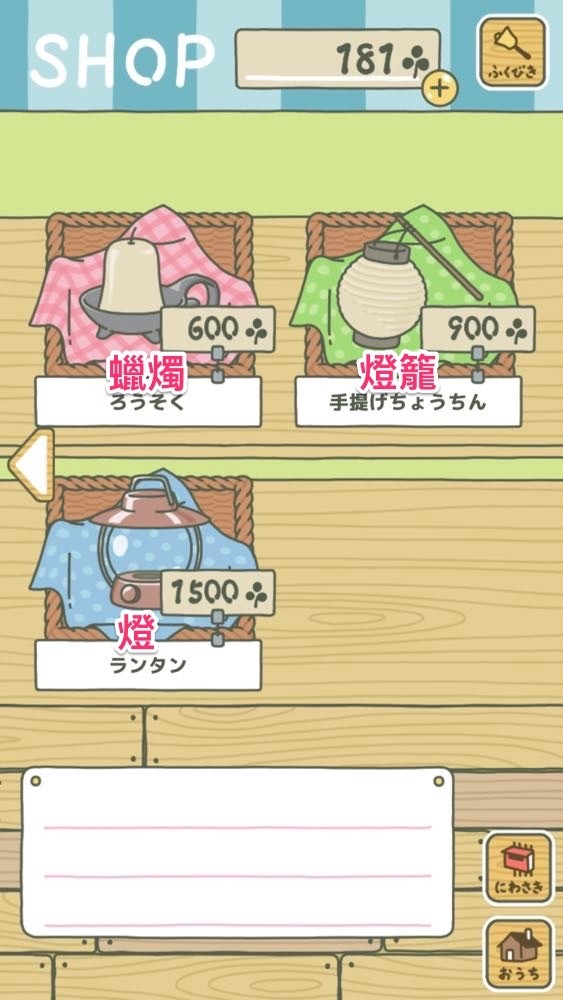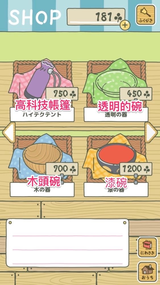 商店中的商品分為食物、道具兩大類,另外一個幸運鈴鐺則和四葉草一樣,屬於護身符系列。