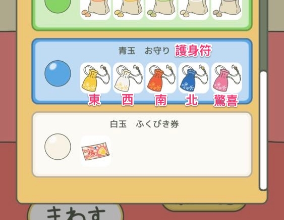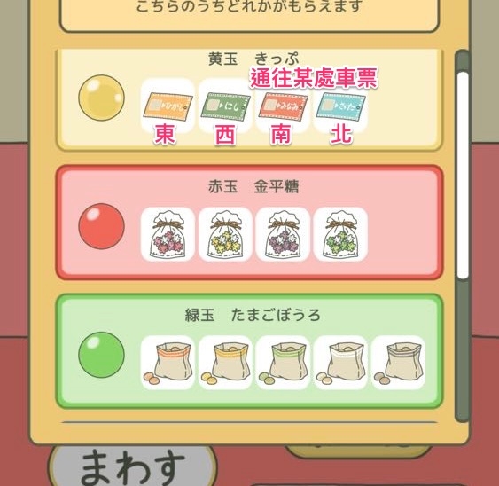 因為每個景點分別有著地理方位的參考,所以我們可以利用抽獎的顏色護身符、抽獎的旅行方向車票、或是可以到寒冷、炎熱等地方的食物來搭配提高蛙兒出遊特定方向的機率。