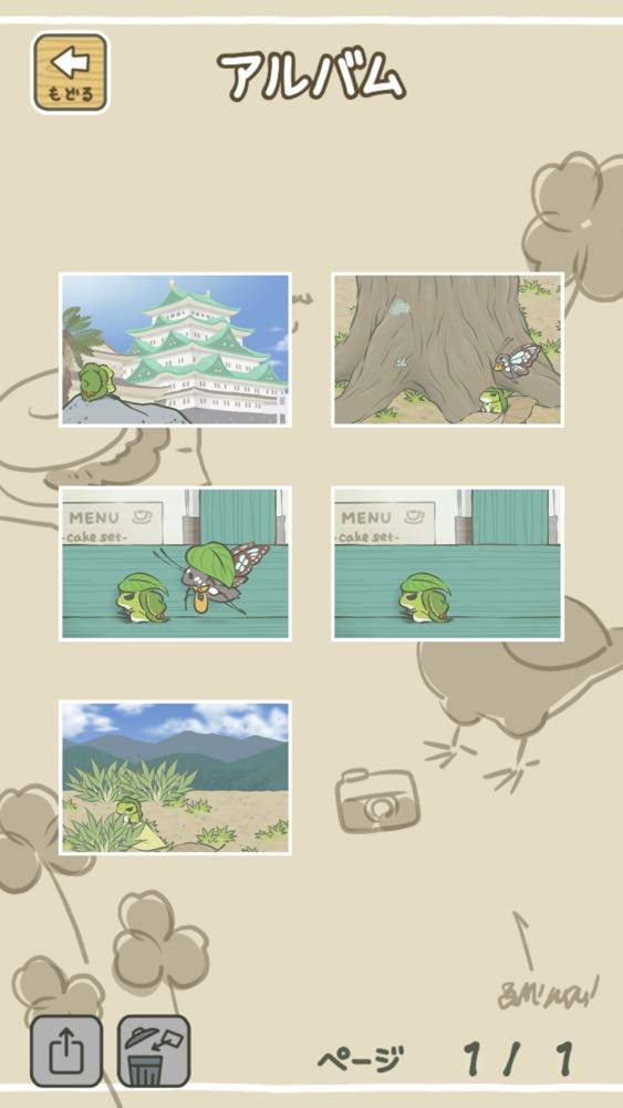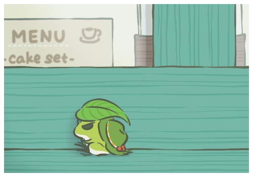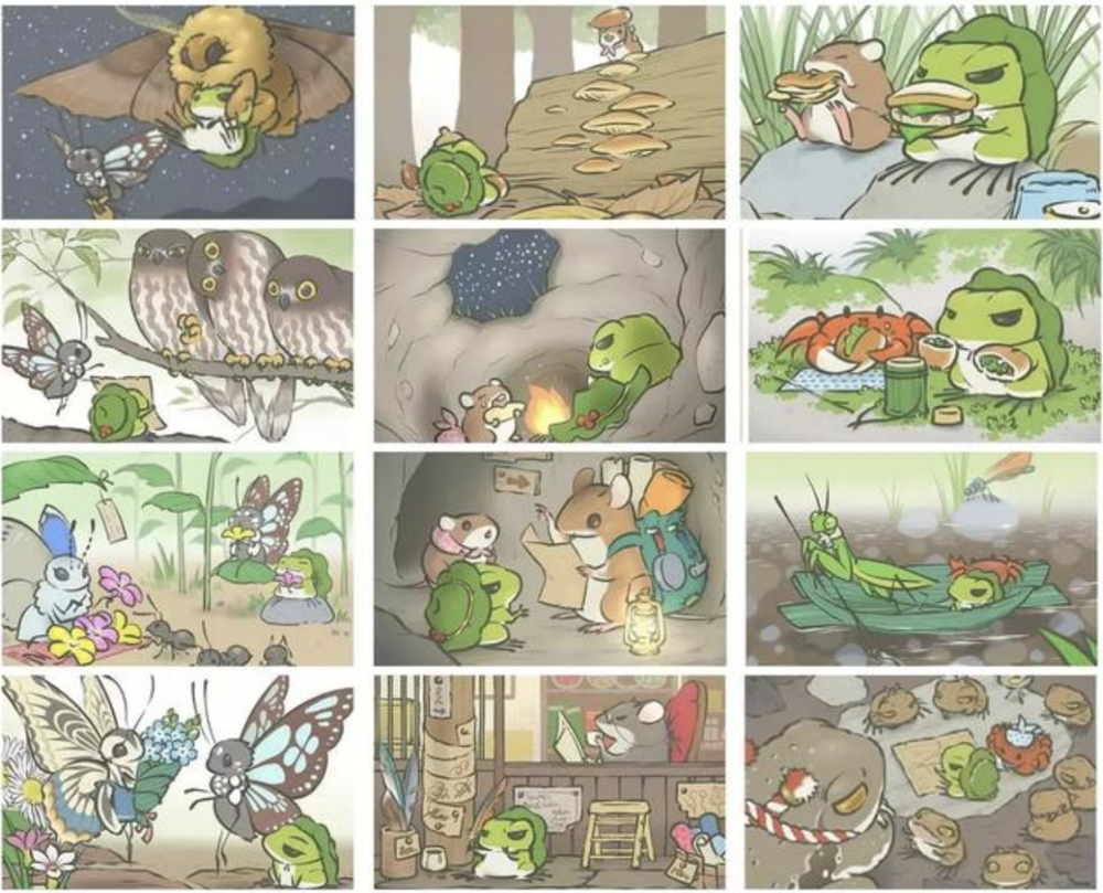 這邊指的就是我們在商店中購買的布、燈籠、碗、帳篷等會搭配在蛙兒身上的明信片,景點則分別有著路邊、咖啡廳門外、帳篷樹林區、漂流在河流上的碗和很像在山洞中提著燈籠的場景。