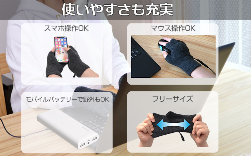 如開頭所述,「USB 指までヒーター手袋」不僅可以接在桌電、筆電的 USB 連接埠上,讓使用者順利操作手機、滑鼠,他還能接在行動電源的 USB 連接埠上,搭配具有高彈性的材質設計,即使外出旅遊、騎乘機車都可以派上用場。