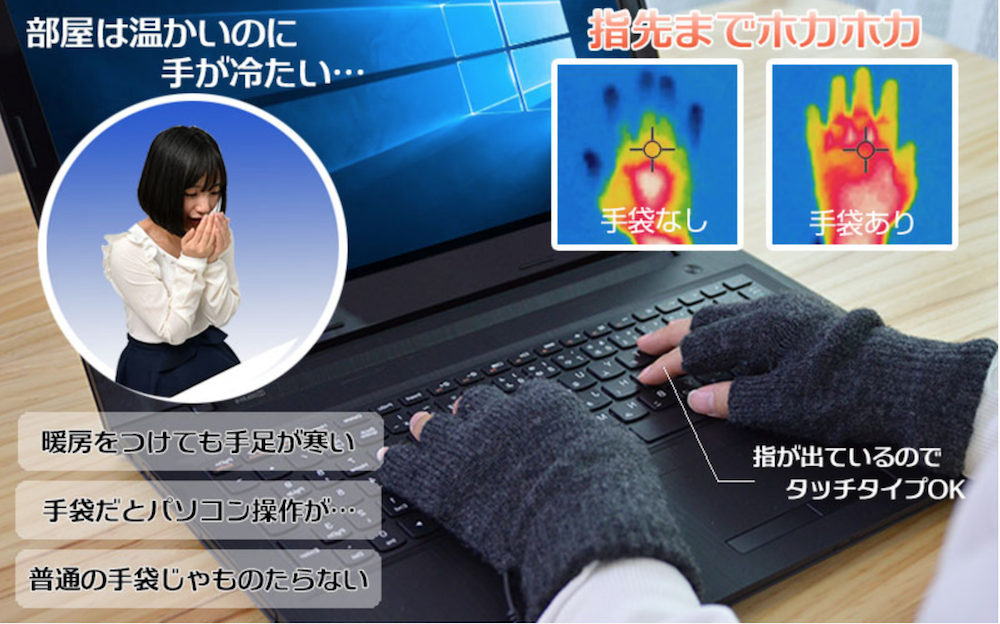 這雙「USB 指までヒーター手袋」手套可不是一般的半指手套,他可是內含加熱模組的控溫手套,只要接上桌電、筆電、甚至是行動電源的 USB 連接埠,就能立刻為手套加溫,讓配戴著手套的雙手能快速溫暖起來,減少冬天寒風刺骨的感受。