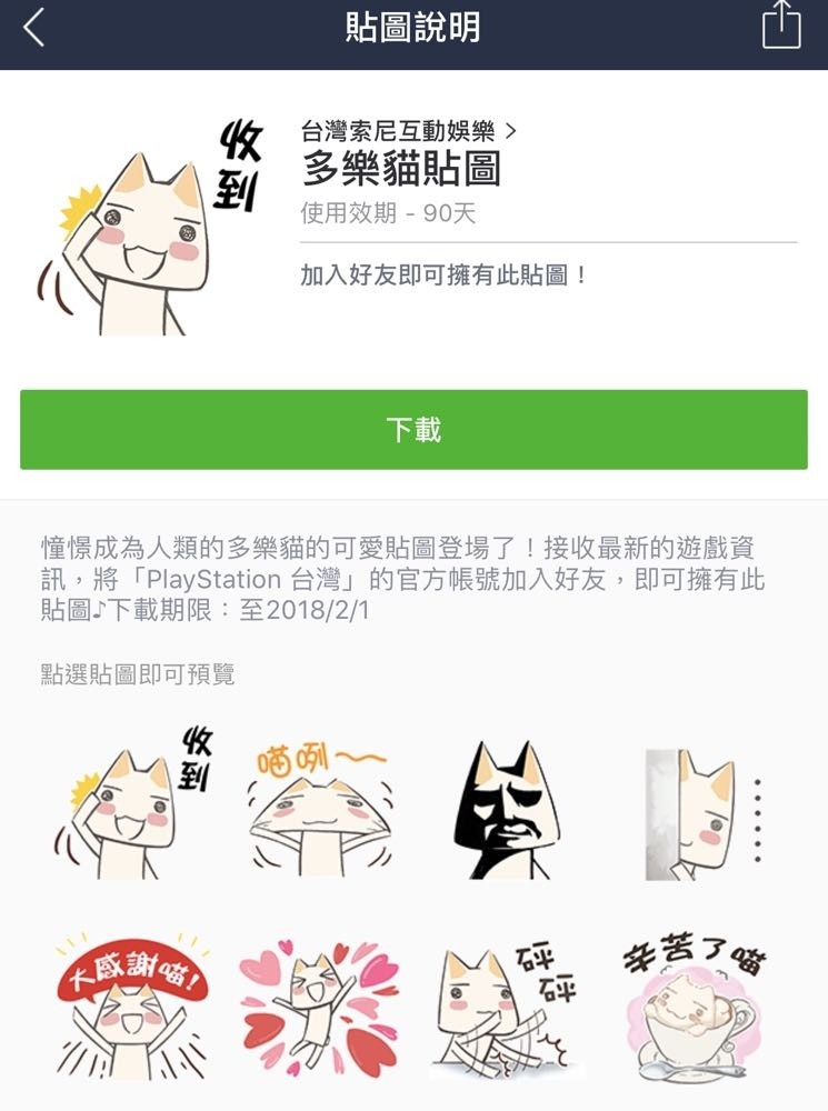 有興趣的消費者只要在 LINE 首頁上方輸入「PS Store 台灣」就能直接選擇加入,再從「貼圖小舖」>>>「新增貼圖」中選擇「PS Store 台灣」後來下載貼圖。「多樂貓」免費貼圖將從即日起至 2 月 1 日開放用戶下載,能夠從下載後免費使用 90 天。