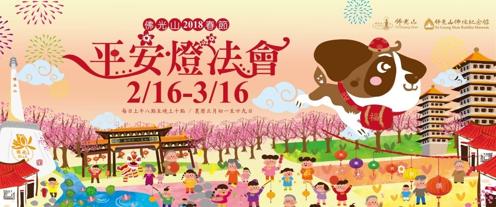 今年適逢戊戌狗年,「佛光山2018年春節平安燈法會」於2月16日至3月16日(農曆正月初一至二十九)熱烈展開。為期一個月的燈會,將以星雲大師題寫的春聯賀辭─「忠義傳家」為主軸,傳遞忠義精神。