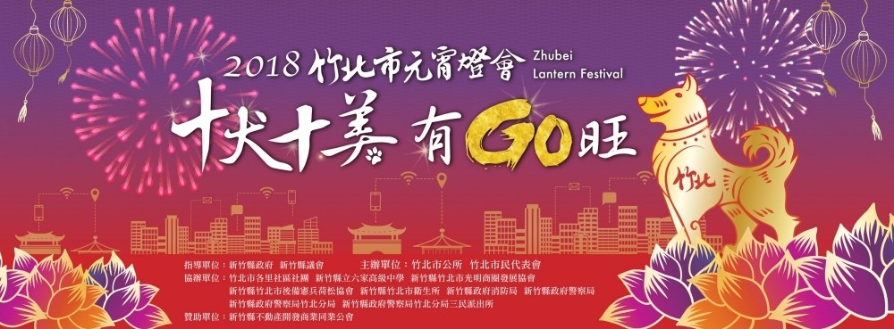 「2018竹北市元宵燈會」於107年2月23日至3月4日,在竹北市 文化公園盛大舉行,共有近40座炫爛花燈及造景燈區,燦爛的福犬主燈燈光秀及年味的音樂響宴讓你一飽眼福!