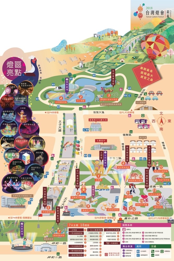 2018台灣燈會將以「水、陸、空」全方位展現,從嘉義縣政府前串聯太子大道到故宮南院,燈區面積將超過50公頃,結合觀光、科技、文化及藝術,展現嘉義縣的在地新價值與創新能量,是一場突破傳統的「智慧型」台灣燈會。