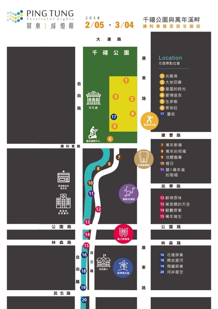 屏東綵燈節從千禧公園勝利東路開始,沿著萬年溪河畔到民生路,沿途分為「歡樂時光」、「祈福療癒」、「聲動光譜」、「魅力屏東」、「熱帶風光」等5大區域,結合燈光、音樂及互動裝置,展現出屏東在地多元文化。
