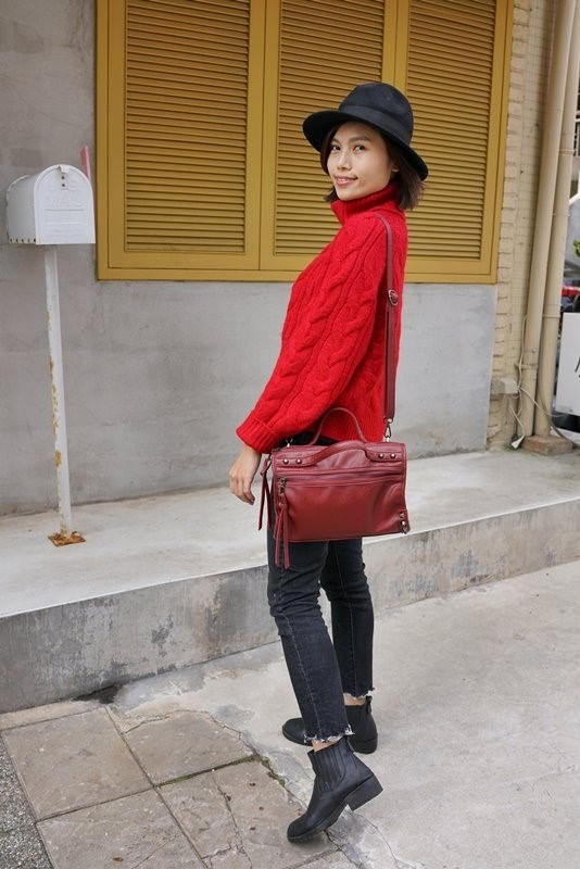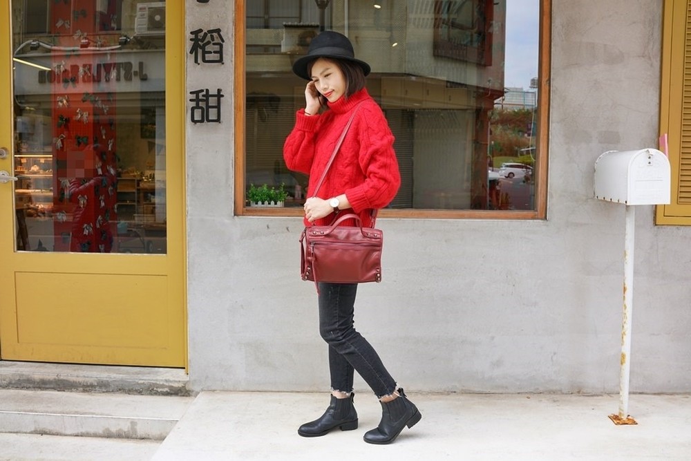 第四套上身是正紅色的翻領毛衣,非常舒服好穿又溫暖,這件衣服詢問度很高,是之前在GU買的,據讀者回報早已被搶購一空,後來想再去買其他顏色也都沒機會了嗚嗚,下身搭配顯瘦的黑色牛仔褲與短靴,把重點放在上半身,整體俐落有個性。