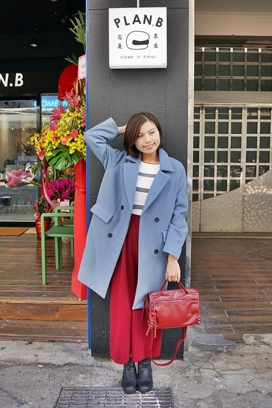 第一套獻給不敢穿大紅色的女孩們,可以從酒紅色單品著手,酒紅色不會太醒目,而且下半身或包包單品的搭配性很高,上半身搭配黑色、白色,或是素雅的條紋樣式都很OK,下半身是寬褲,上身就可以選擇比較fit的針織衫,天氣冷就加件大衣。