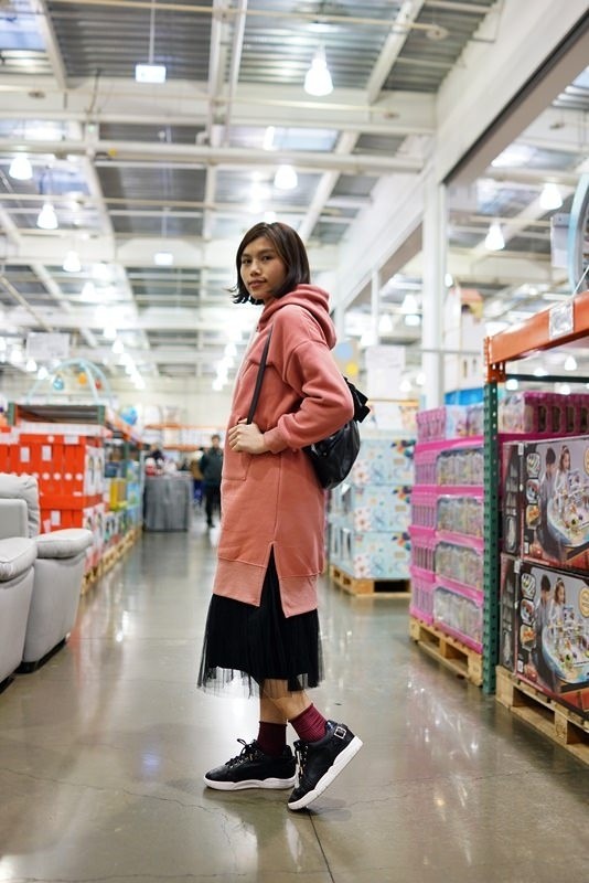 單穿很休閒的長版帽T,內搭一件黑色紗裙,就立馬變可愛啦!這款帽T是有點莓紅色的,顏色很討喜,很適合過年過節穿。